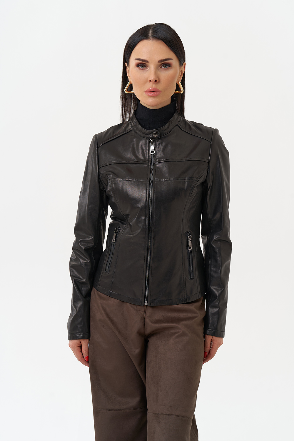 Элегантная женская куртка из натуральной кожи в черном цвете с бронзовым блеском. Классический полуприлегающий фасон подойдет для сдержанных и элегантных образов. Данный оттенок сочетается со всеми цветами, что делает данную куртку базовой в вашем гардеробе. Фигурные вытачки данной модели визуально стройнят. Изделие дополнено аккуратным воротом-стойкой и молнией. Представлен большой размерный ряд от 42 до 52 размера.