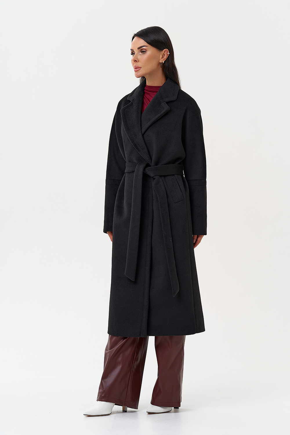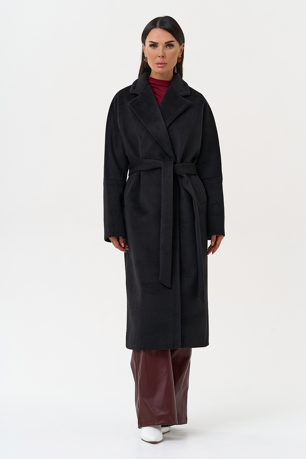 Силуэт - прямой Цвет - черный Длина - 115 см Вид полотна - тканое Состав полотна - шерсть 80%, п/э 20% Вид застежки - кнопки Крой воротника - английский воротник Фасон рукава - спущенное плечо, длинный Фасон кармана - прорезной Пояс |