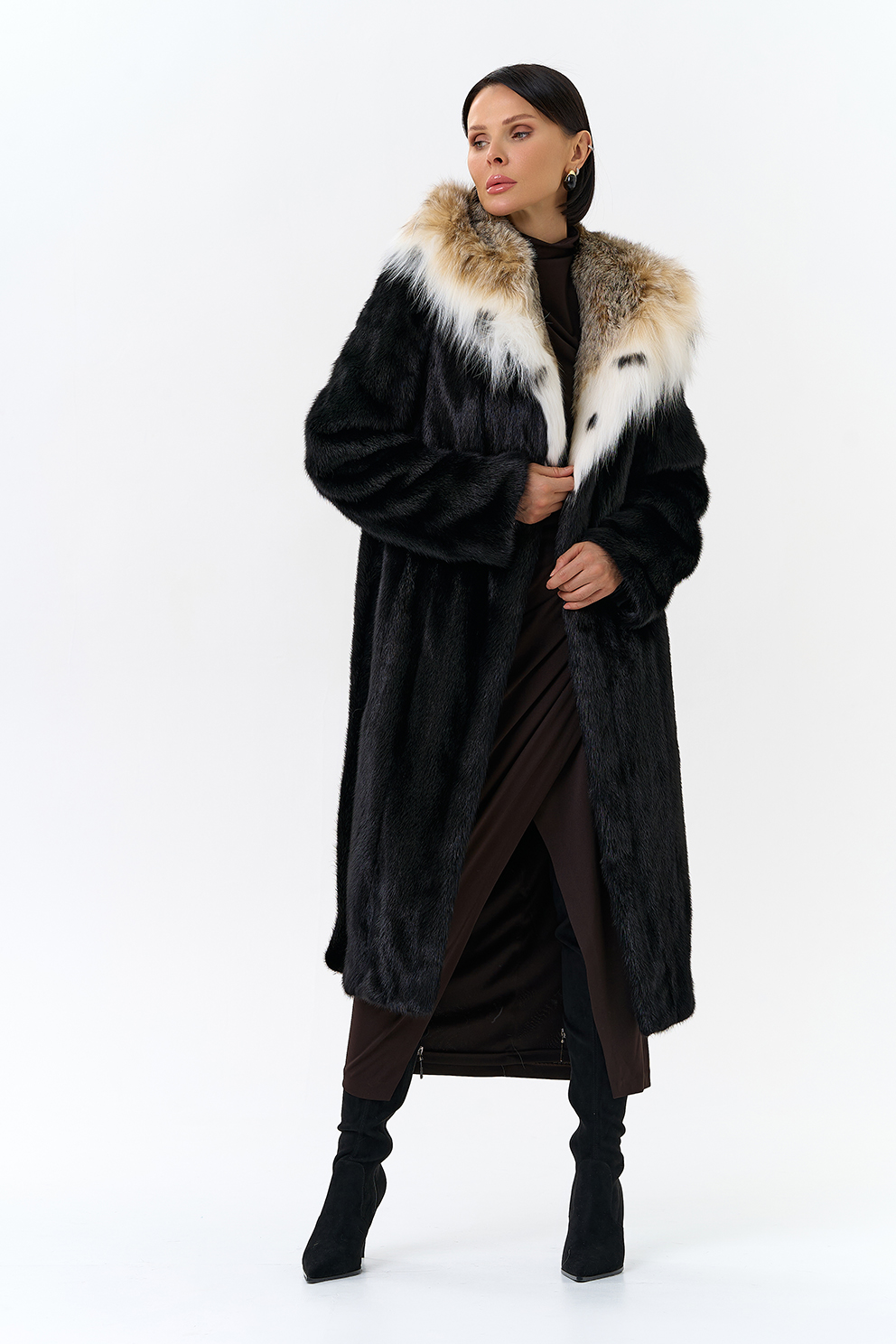 Норковая шуба с капюшоном с отделкой из рыси